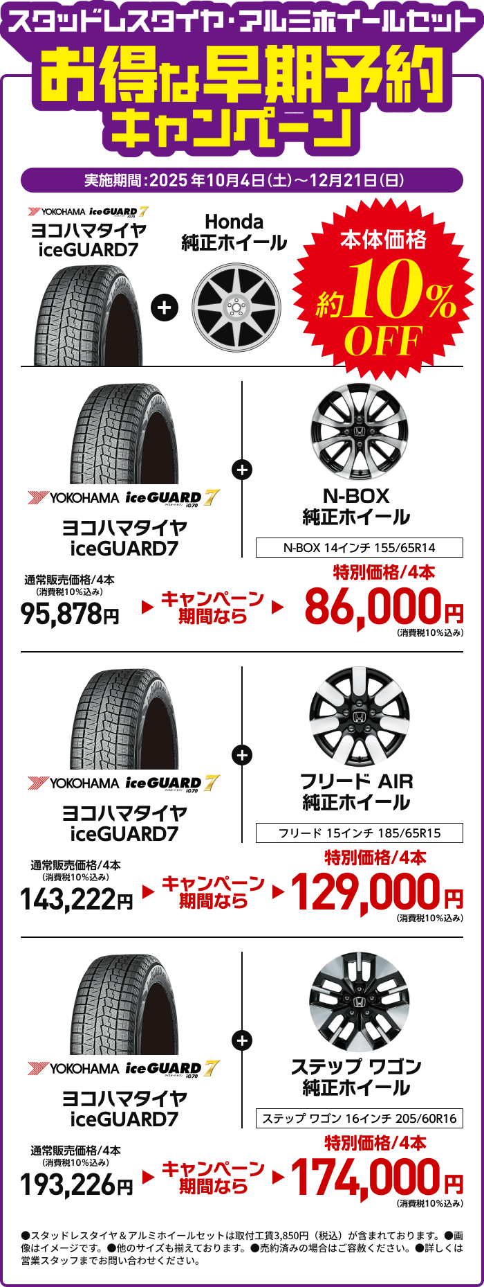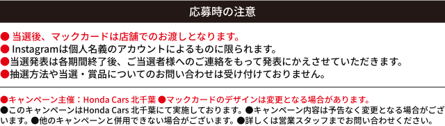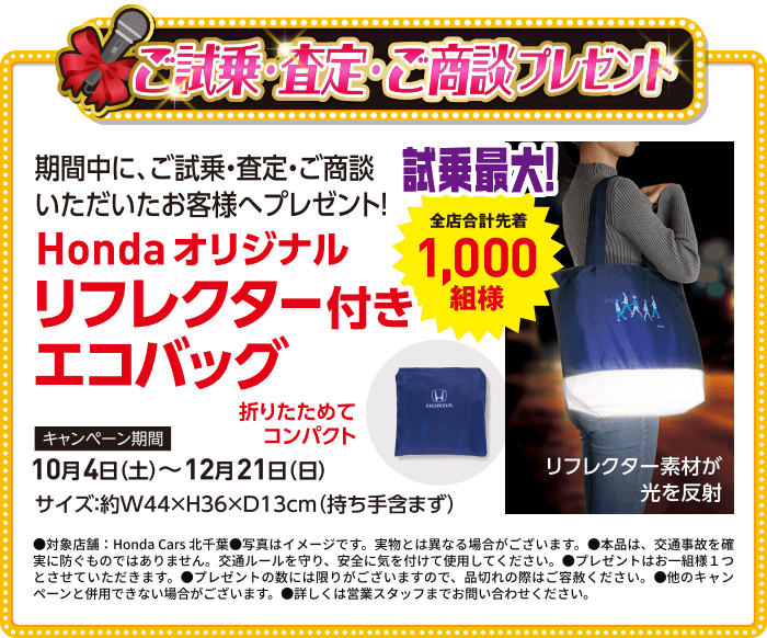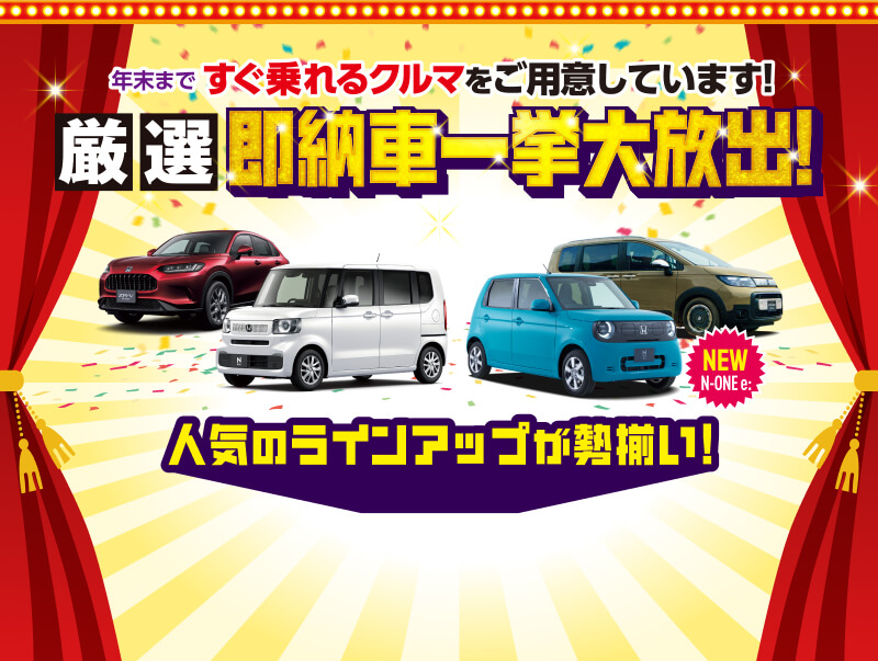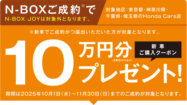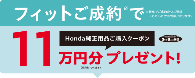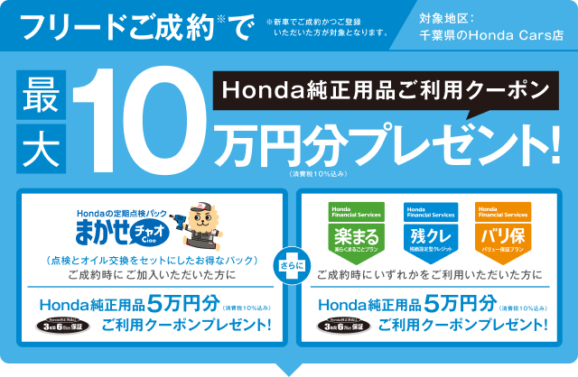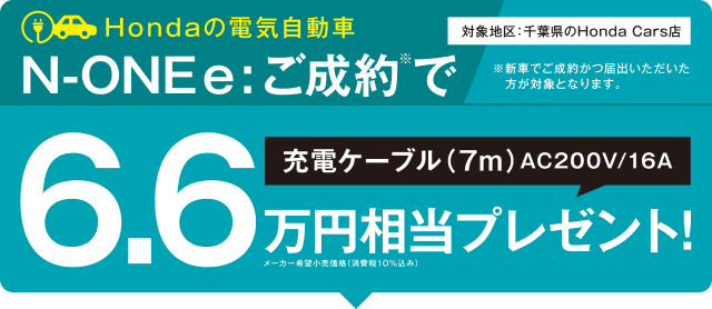 【N-BOXご成約プレゼントについて】●一部のタイプ、カラーによっては届出に時間を要するため対象とならない場合がございます。●詳しくは営業スタッフまでお問い合わせください。●N-BOX(CUSTOM含む、N-BOX JOYは対象外)を新車でご成約かつ届出いただいた方が対象となります。●クーポンはご成約いただいた販売店でのみ有効です。●当キャンペーン権利の他人への譲渡や換金、値引きはできません。●他のキャンペーンと併用できない場合があります。 【N-ONE e:ご成約プレゼントについて】●このキャンペーンは予告なく終了する場合がございます。●一部のタイプ、カラーによっては届出に時間を要するため対象とならない場合がございます。●詳しくは営業スタッフまでお問い合わせください。●N-ONE e:を新車でご成約かつ届出いただいたお客様に、充電ケーブル(7m)AC200V/16Aをプレゼントいたします。●当キャンペーン権利の他人への譲渡や換金、値引きはできません。●他のキャンペーンと併用できない場合があります。●充電ケーブル(7m)の価格はメーカー希望小売価格(消費税込み)で参考価格です。販売価格は販売会社が独自に定めております。 【フリードご成約プレゼントについて】●楽まるご利用の場合はメンテナンス費用が含まれるためHonda純正用品ご利用クーポン最大10万円分(消費税10%込み)をプレゼントいたします。●このキャンペーンは予告なく終了する場合がございます。●一部のタイプ、カラーによっては登録に時間を要するため対象とならない場合がございます。●詳しくは営業スタッフまでお問い合わせください。●フリードを新車でご成約かつ登録いただき、まかせチャオ新車コースにご加入いただいた方を対象にHonda純正用品ご利用クーポン5万円分(消費税10%込み)をプレゼントいたします。さらに楽まる(楽らくまるごとプラン)・残クレ(残価設定型クレジット)・バリ保(バリュー保証プラン)のいずれかご利用でHonda純正用品ご利用クーポン5万円分(消費税10%込み)をプレゼントいたします。●クーポンはご成約いただいた販売店でのみ有効です。●クーポンは対象車種のホンダアクセス・アクセサリー車種サイトに掲載されているHonda純正用品(Hondaカーケアメニュー、ケミカル用品 〈一部〉除く)にご利用いただけます。●クーポン金額は用品代+工賃の合計分となります。●クーポン金額を超える代金は、ご成約者様のご負担とさせていただきます。また、総額がクーポン金額に満たない場合の返金、値引きはありません。●当キャンペーン権利の他人への譲渡や換金、値引きはできません。●他のキャンペーンと併用できない場合があります。 【フィットご成約プレゼントについて】●このキャンペーンは予告なく終了する場合がございます。あらかじめご了承ください。●一部のタイプ、カラーによっては登録に時間を要するため対象とならない場合がございます。 ●詳しくは販売会社までお問い合わせください。●フィットを新車でご成約かつご登録いただいた方が対象となります。●クーポンはご成約いただいた販売店でのみ有効です。●クーポンは対象車種のHonda純正アクセサリー車種サイトに掲載されているHonda純正用品(Hondaカーケアメニュー、ケミカル用品〈一部〉除く)にご利用いただけます。●工賃・取付アタッチメント費はご成約者様のご負担となる場合がございます。●クーポン金額を超える代金は、ご成約者様のご負担とさせていただきます。また、総額がクーポン金額に満たない場合の返金、値引きはありません。●当キャンペーン権利の他人への譲渡や換金、値引きはできません。●他のキャンペーンと併用できない場合があります。