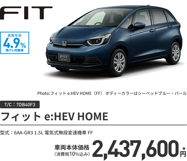フィット e:HEV HOME(FF) ボディーカラー/有料色 メーカーオプションなし〈実質年率4.9% 60回(5年)払い〉車両本体価格(消費税10%込み)2,437,600円★の場合