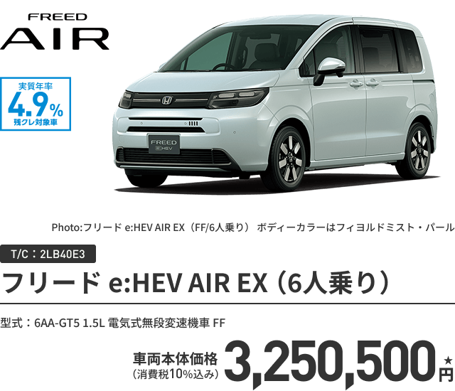 フリード e:HEV AIR EX(FF/6人乗り)ボディーカラー/有料色 メーカーオプションなし〈実質年率4.9% 60回(5年)払い〉車両本体価格(消費税10%込み)3,250,500円★の場合