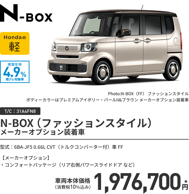 N-BOX(FF)ファッションスタイル ボディーカラー/一般色(2トーン) メーカーオプションあり〈実質年率4.9% 60回(5年)払い〉車両本体価格(消費税10%込み)1,976,700円★の場合