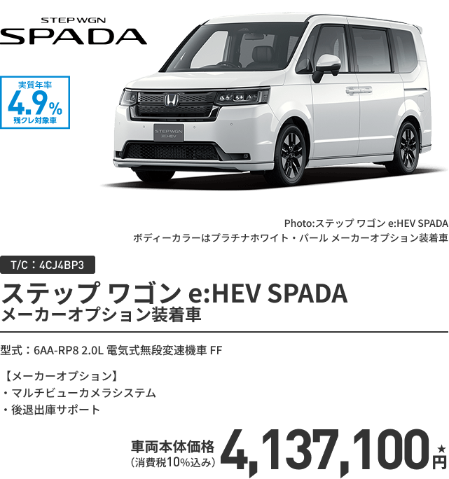 ステップ ワゴン e:HEV SPADA (FF) ボディーカラー/有料色 メーカーオプションあり〈実質年率4.9% 60回(5年)払い〉車両本体価格(消費税10%込み)4,137,100円★の場合