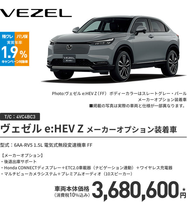 ヴェゼル e:HEV Z(FF) ボディーカラー/有料色 メーカーオプションあり〈実質年率1.9% 60回(5年)払い〉車両本体価格(消費税10%込み)3,680,600円★の場合
