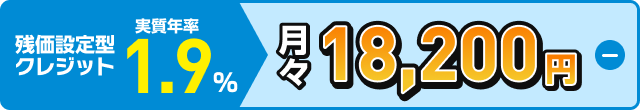 ●頭金500,000円 ●所要資金(割賦元金)1,476,700円 ●初回お支払い月額18,243円 ●2回目以降お支払い月額15,800円(×58回) ●最終回お支払い額※ @新車に乗り換え0円 A乗り続ける826,620円 B車両を返却0円 ●お支払い総額 @Bの場合1,434,643円 Aの場合2,261,263円